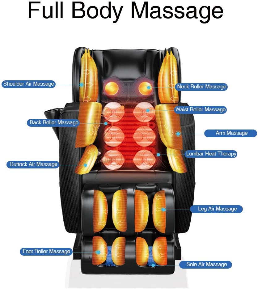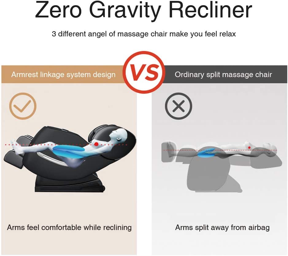 - Zero gravity full body massage chair: Feeling real relax physically and mentally when you are experiencing “Zero-Gravity” model, your legs are higher than your heart level, it can relieve full body pressure.