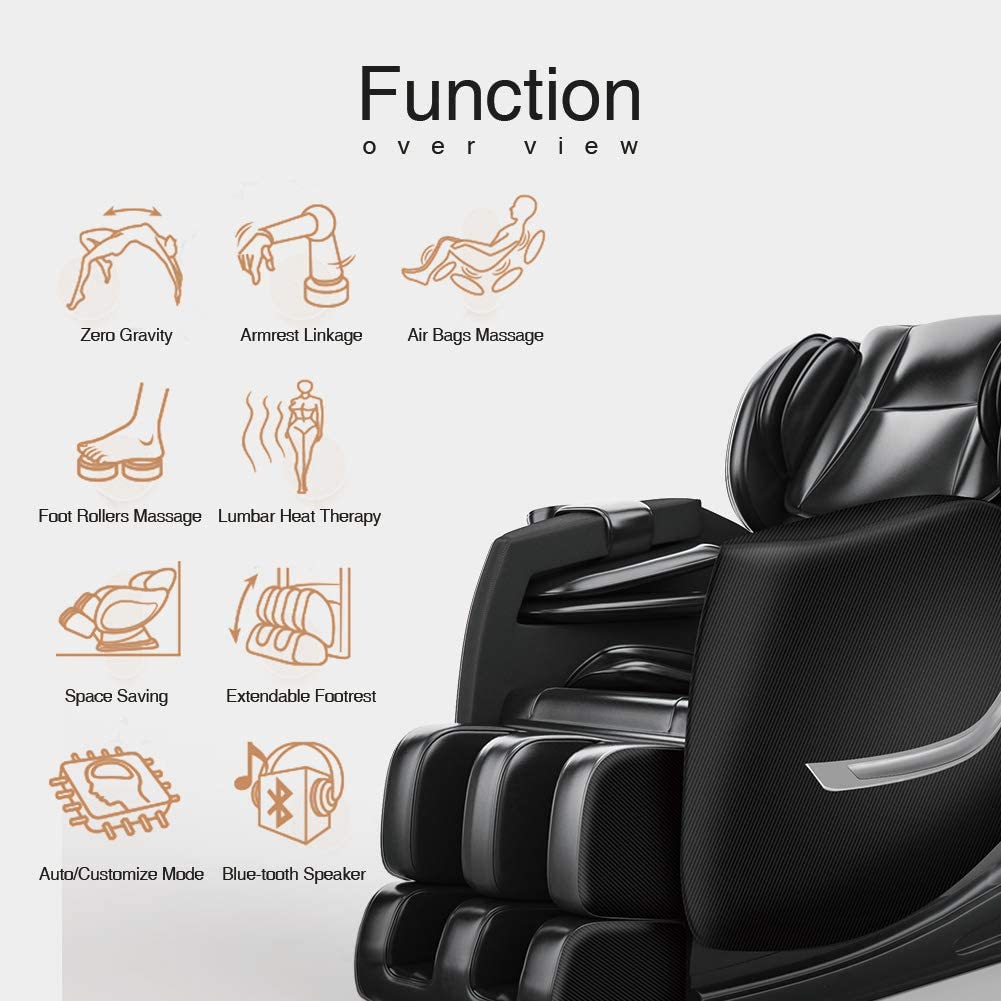 - Multifunction massage chair of effective cost: zero gravity, 8 back rollers, full body air pressure massage, foot roller massage and bluetooth.
