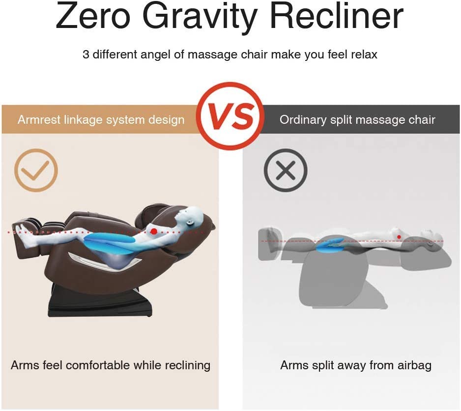 - Zero gravity full body massage chair: Feeling real relax physically and mentally when you are experiencing “Zero-Gravity” model, your legs are higher than your heart level, it can relieve full body pressure.